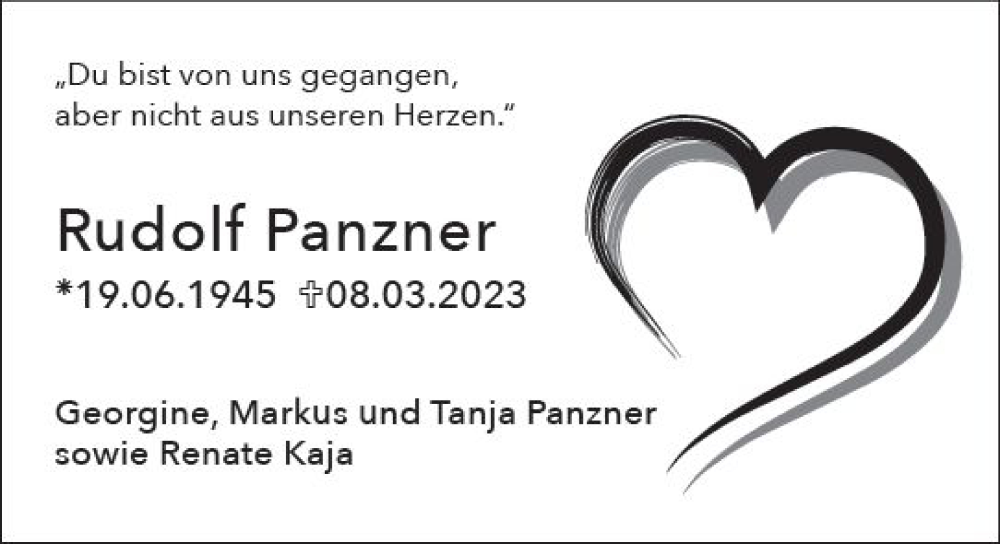 Hier finden Sie alle Traueranzeigen aus der Zeitung, die bisher für Rudolf Panzner erschienen sind. Weitere Traueranzeigen, die in der Zeitung erscheinen, werden hier ebenfalls aufgelistet