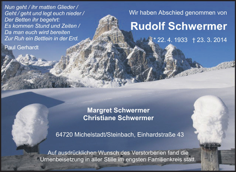 Hier finden Sie alle Traueranzeigen aus der Zeitung, die bisher für Rudolf Schwermer erschienen sind. Weitere Traueranzeigen, die in der Zeitung erscheinen, werden hier ebenfalls aufgelistet
