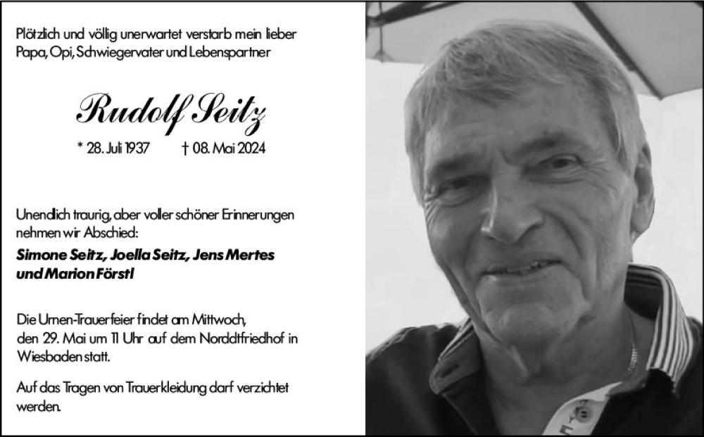 Hier finden Sie alle Traueranzeigen aus der Zeitung, die bisher für Rudolf Seitz erschienen sind. Weitere Traueranzeigen, die in der Zeitung erscheinen, werden hier ebenfalls aufgelistet