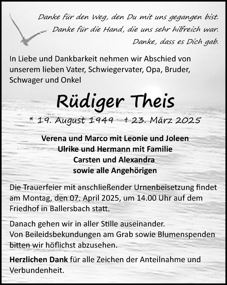 Hier finden Sie alle Traueranzeigen aus der Zeitung, die bisher für Rüdiger Theis erschienen sind. Weitere Traueranzeigen, die in der Zeitung erscheinen, werden hier ebenfalls aufgelistet