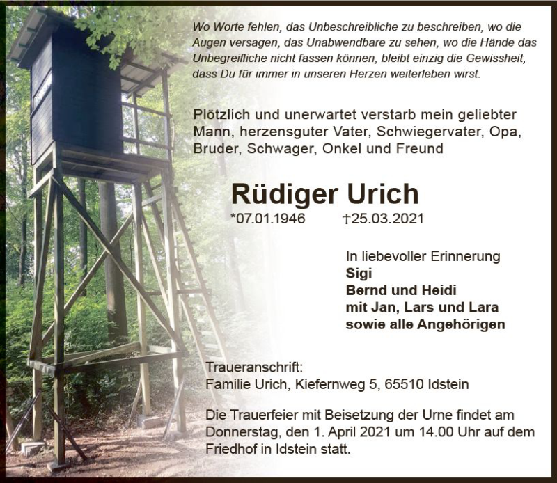 Hier finden Sie alle Traueranzeigen aus der Zeitung, die bisher für Rüdiger Urich erschienen sind. Weitere Traueranzeigen, die in der Zeitung erscheinen, werden hier ebenfalls aufgelistet