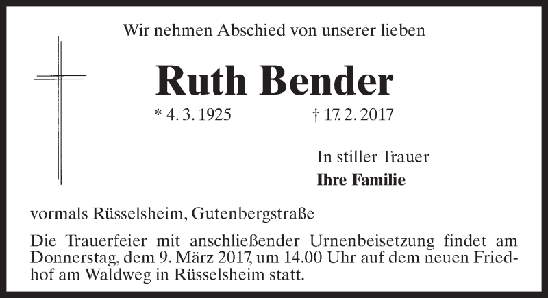 Hier finden Sie alle Traueranzeigen aus der Zeitung, die bisher für Ruth Bender erschienen sind. Weitere Traueranzeigen, die in der Zeitung erscheinen, werden hier ebenfalls aufgelistet
