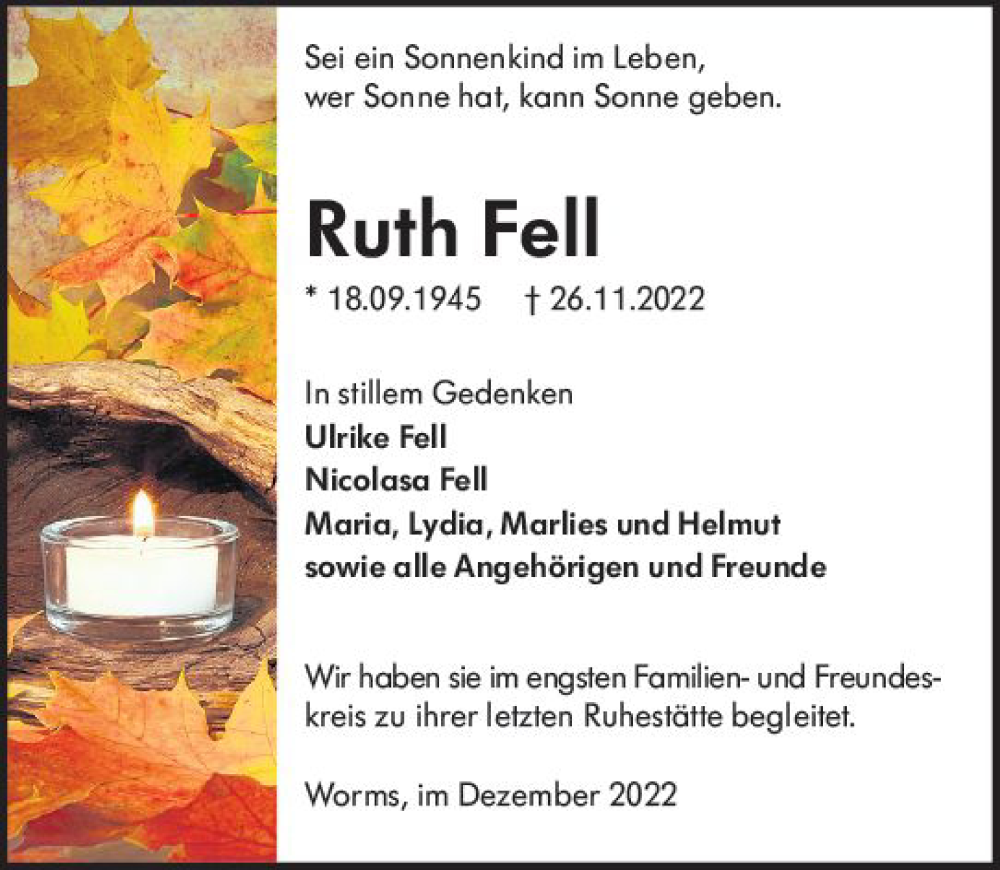 Hier finden Sie alle Traueranzeigen aus der Zeitung, die bisher für Ruth Fell erschienen sind. Weitere Traueranzeigen, die in der Zeitung erscheinen, werden hier ebenfalls aufgelistet