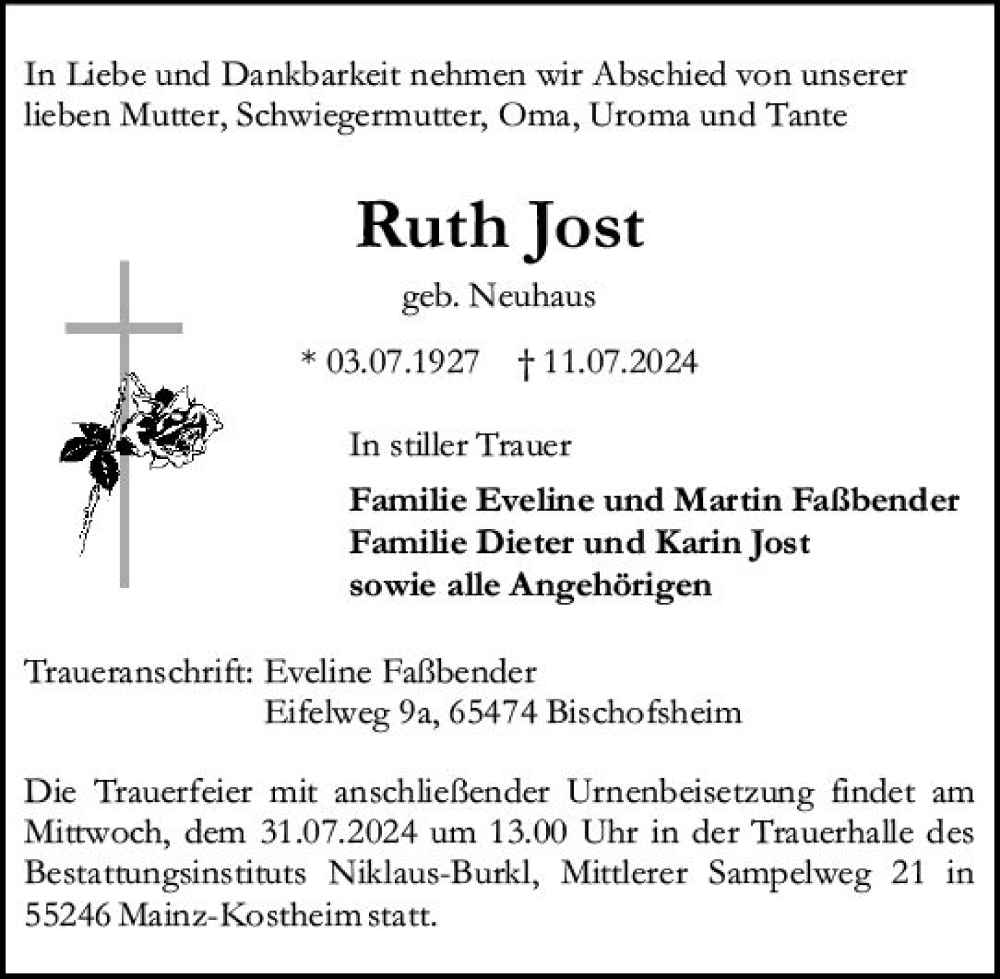 Hier finden Sie alle Traueranzeigen aus der Zeitung, die bisher für Ruth Jost erschienen sind. Weitere Traueranzeigen, die in der Zeitung erscheinen, werden hier ebenfalls aufgelistet