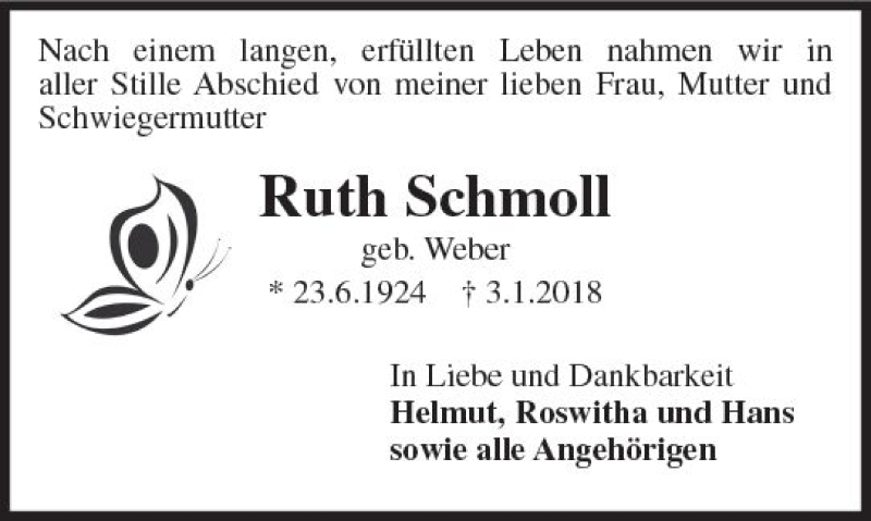 Hier finden Sie alle Traueranzeigen aus der Zeitung, die bisher für Ruth Schmoll erschienen sind. Weitere Traueranzeigen, die in der Zeitung erscheinen, werden hier ebenfalls aufgelistet