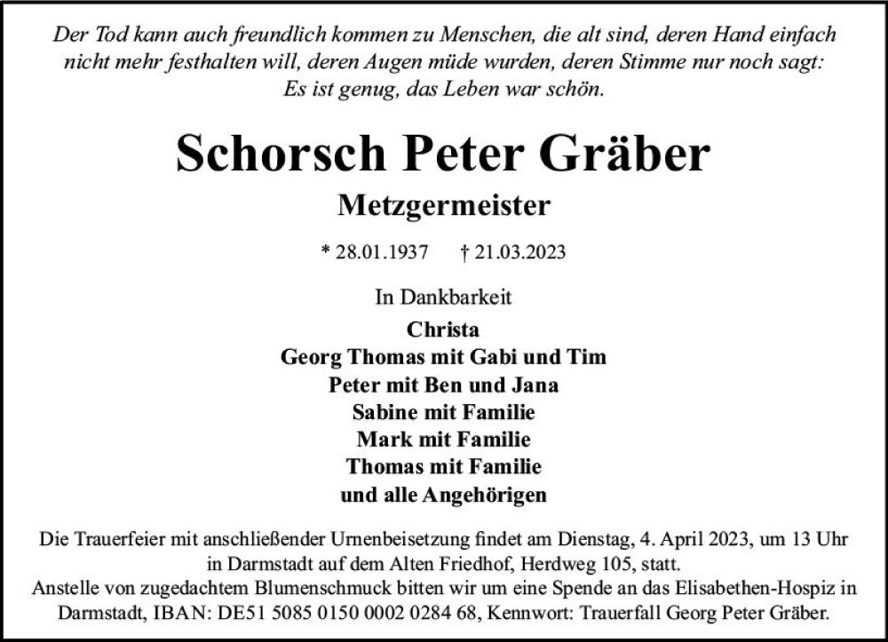 Hier finden Sie alle Traueranzeigen aus der Zeitung, die bisher für Schorsch Peter Gräber erschienen sind. Weitere Traueranzeigen, die in der Zeitung erscheinen, werden hier ebenfalls aufgelistet