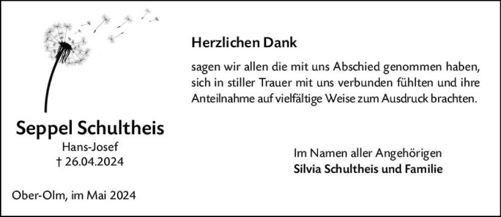 Hier finden Sie alle Traueranzeigen aus der Zeitung, die bisher für Seppel Schultheis erschienen sind. Weitere Traueranzeigen, die in der Zeitung erscheinen, werden hier ebenfalls aufgelistet