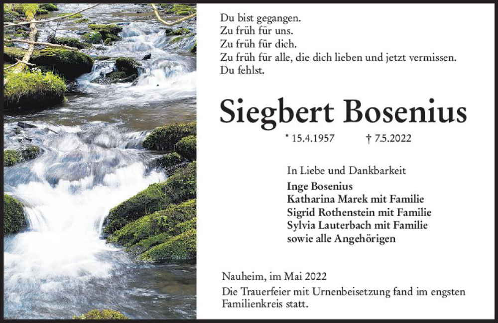 Hier finden Sie alle Traueranzeigen aus der Zeitung, die bisher für Siegbert Bosenius erschienen sind. Weitere Traueranzeigen, die in der Zeitung erscheinen, werden hier ebenfalls aufgelistet