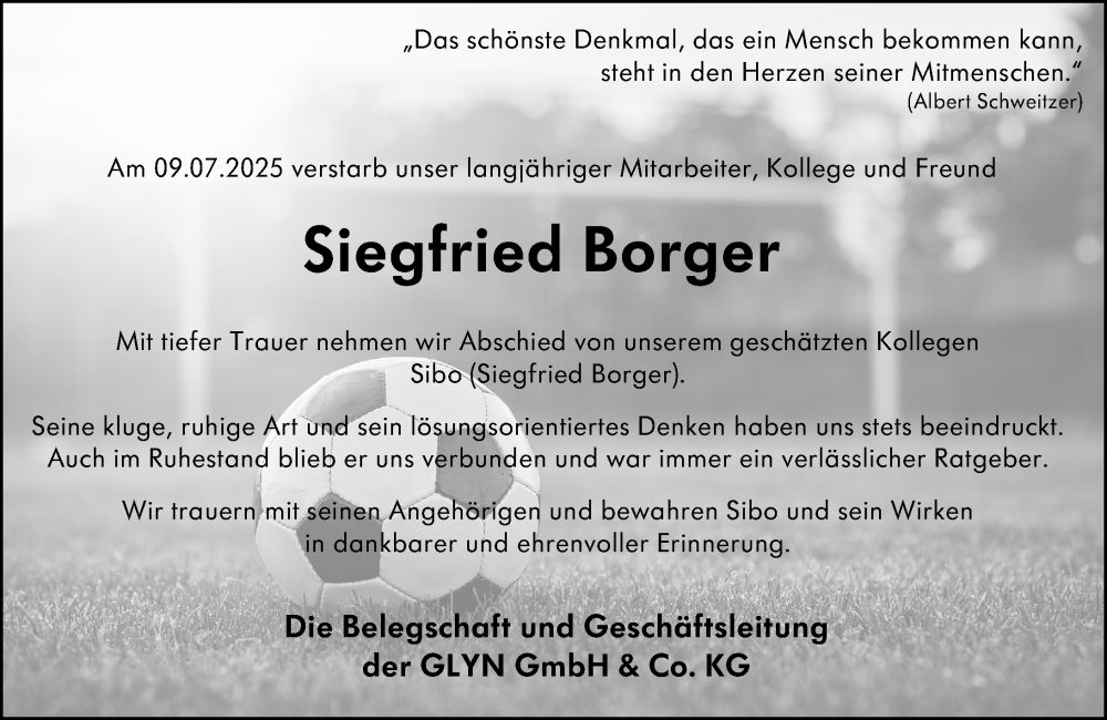Hier finden Sie alle Traueranzeigen aus der Zeitung, die bisher für Siegfried Borger erschienen sind. Weitere Traueranzeigen, die in der Zeitung erscheinen, werden hier ebenfalls aufgelistet
