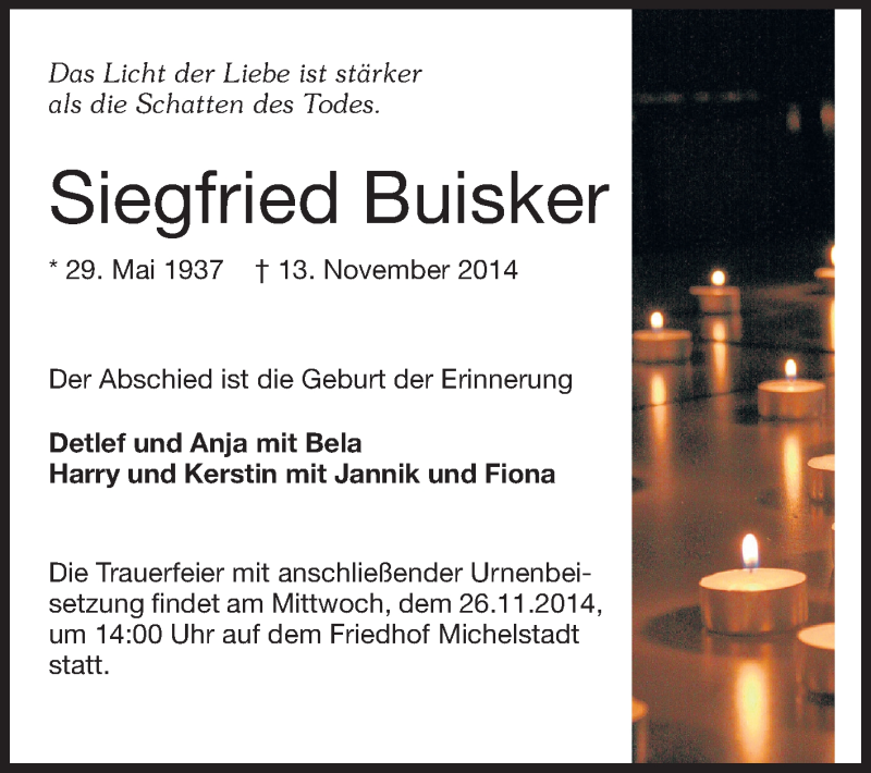 Hier finden Sie alle Traueranzeigen aus der Zeitung, die bisher für Siegfried Buisker erschienen sind. Weitere Traueranzeigen, die in der Zeitung erscheinen, werden hier ebenfalls aufgelistet