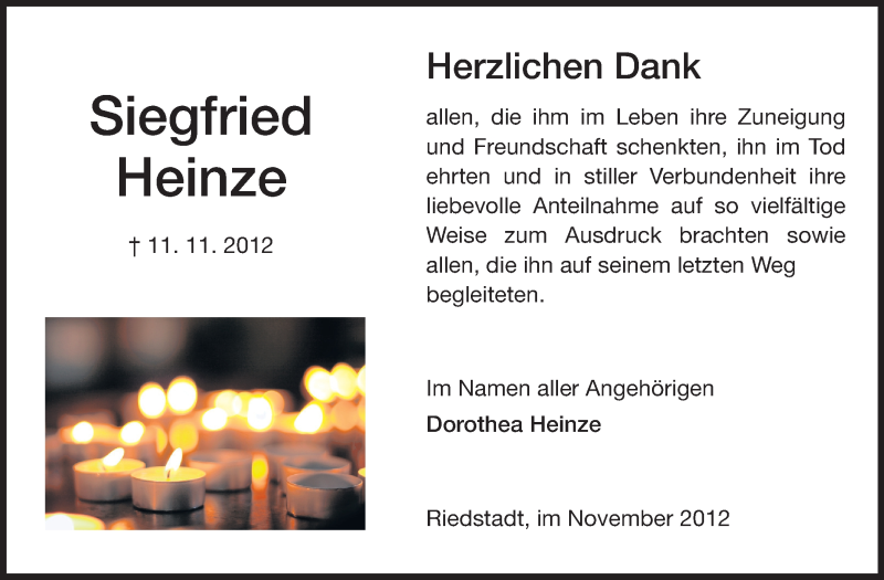 Hier finden Sie alle Traueranzeigen aus der Zeitung, die bisher für Siegfried Heinze erschienen sind. Weitere Traueranzeigen, die in der Zeitung erscheinen, werden hier ebenfalls aufgelistet