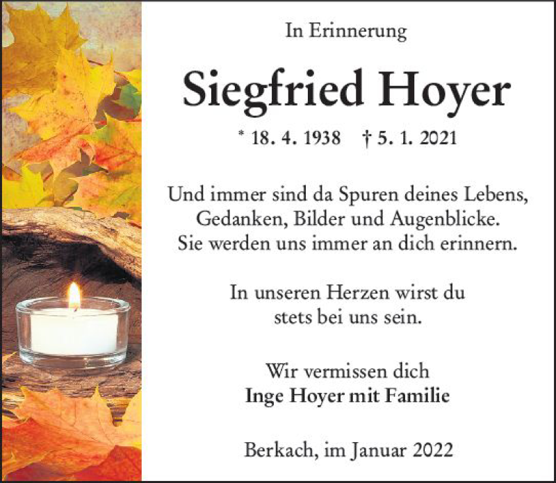 Hier finden Sie alle Traueranzeigen aus der Zeitung, die bisher für Siegfried Hoyer erschienen sind. Weitere Traueranzeigen, die in der Zeitung erscheinen, werden hier ebenfalls aufgelistet