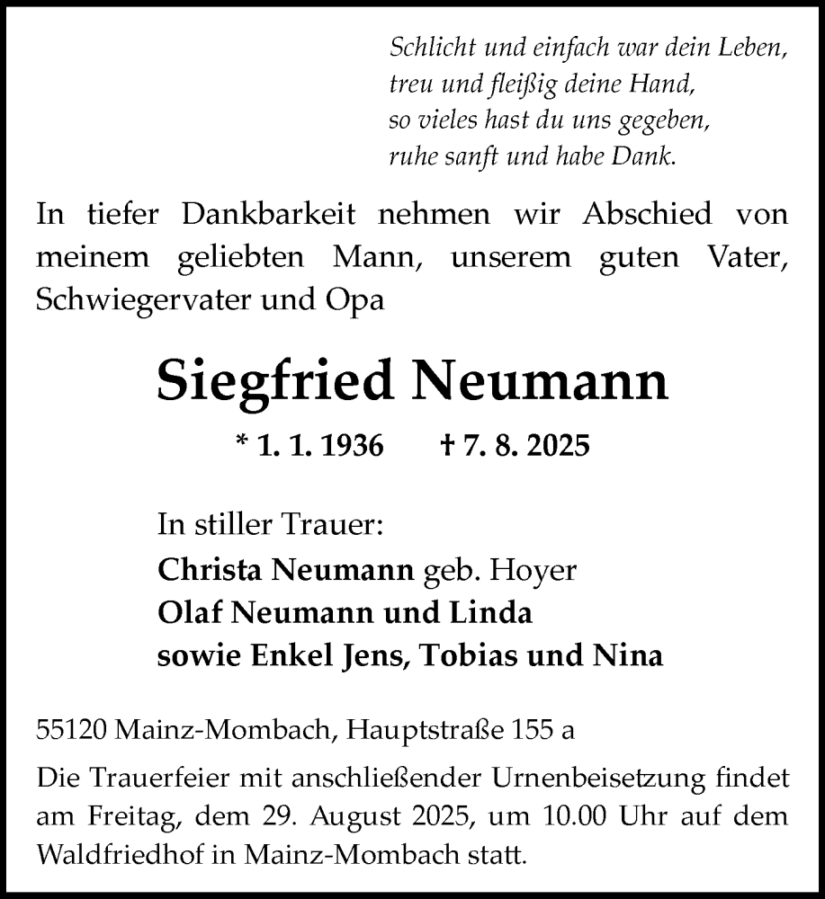 Hier finden Sie alle Traueranzeigen aus der Zeitung, die bisher für Siegfried Neumann erschienen sind. Weitere Traueranzeigen, die in der Zeitung erscheinen, werden hier ebenfalls aufgelistet
