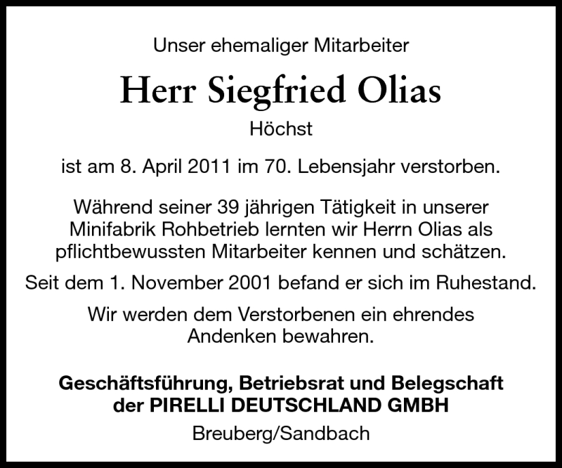 Hier finden Sie alle Traueranzeigen aus der Zeitung, die bisher für Siegfried Olias erschienen sind. Weitere Traueranzeigen, die in der Zeitung erscheinen, werden hier ebenfalls aufgelistet