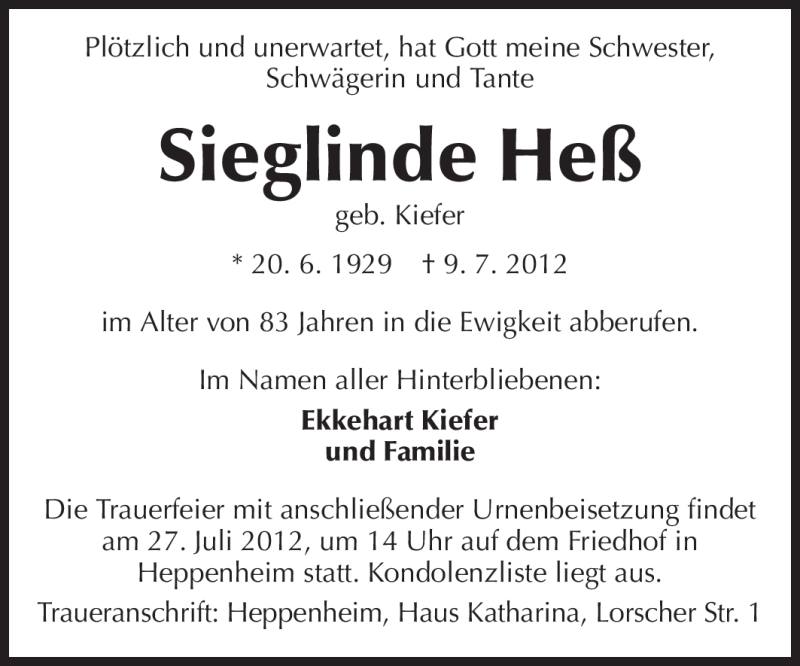 Hier finden Sie alle Traueranzeigen aus der Zeitung, die bisher für Sieglinde Heß erschienen sind. Weitere Traueranzeigen, die in der Zeitung erscheinen, werden hier ebenfalls aufgelistet