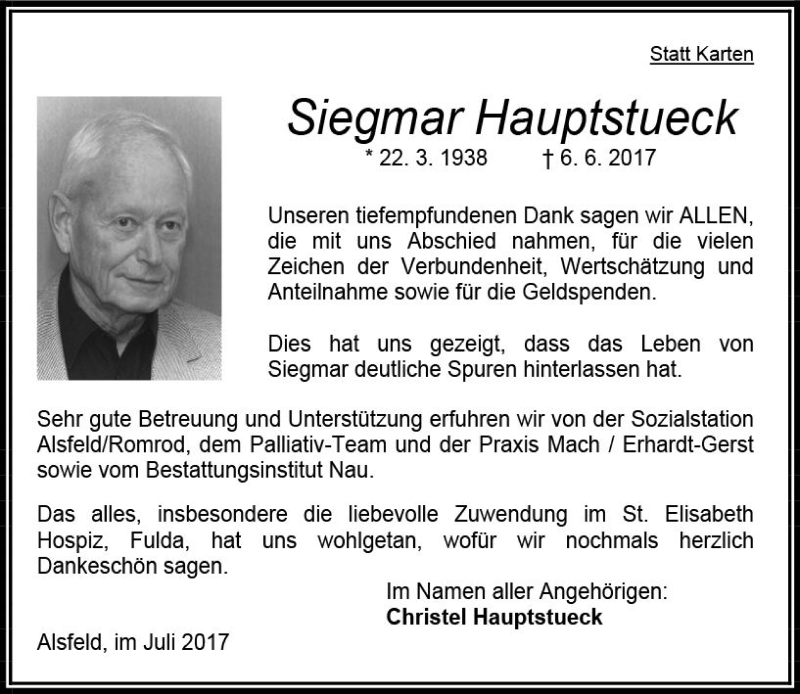 Hier finden Sie alle Traueranzeigen aus der Zeitung, die bisher für Siegmar Hauptstueck erschienen sind. Weitere Traueranzeigen, die in der Zeitung erscheinen, werden hier ebenfalls aufgelistet