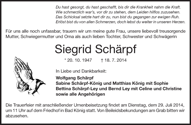 Hier finden Sie alle Traueranzeigen aus der Zeitung, die bisher für Siegrid Schärpf erschienen sind. Weitere Traueranzeigen, die in der Zeitung erscheinen, werden hier ebenfalls aufgelistet