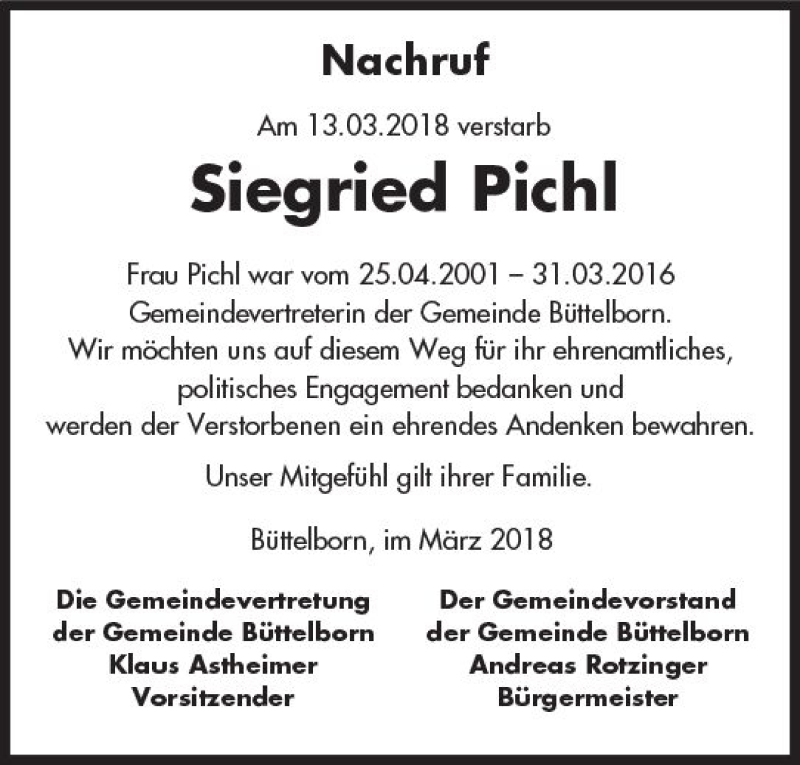 Hier finden Sie alle Traueranzeigen aus der Zeitung, die bisher für Siegried Pichl erschienen sind. Weitere Traueranzeigen, die in der Zeitung erscheinen, werden hier ebenfalls aufgelistet