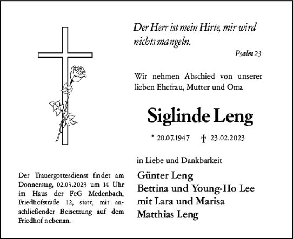 Hier finden Sie alle Traueranzeigen aus der Zeitung, die bisher für Siglinde Leng erschienen sind. Weitere Traueranzeigen, die in der Zeitung erscheinen, werden hier ebenfalls aufgelistet