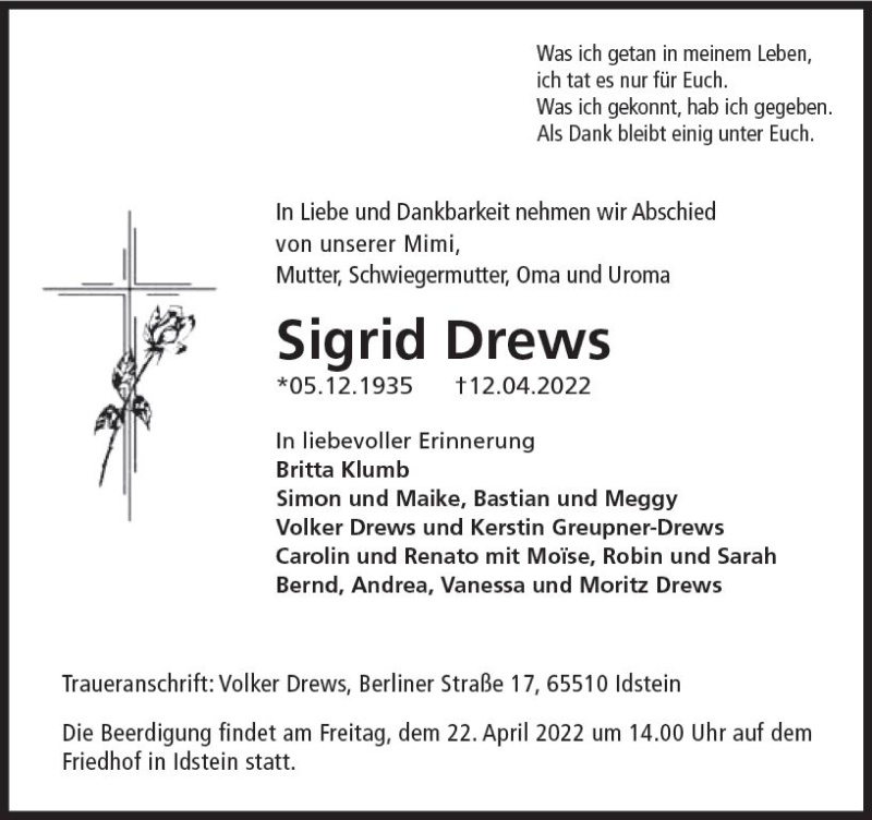 Hier finden Sie alle Traueranzeigen aus der Zeitung, die bisher für Sigrid Drews erschienen sind. Weitere Traueranzeigen, die in der Zeitung erscheinen, werden hier ebenfalls aufgelistet