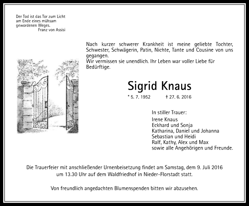 Hier finden Sie alle Traueranzeigen aus der Zeitung, die bisher für Sigrid Knaus erschienen sind. Weitere Traueranzeigen, die in der Zeitung erscheinen, werden hier ebenfalls aufgelistet
