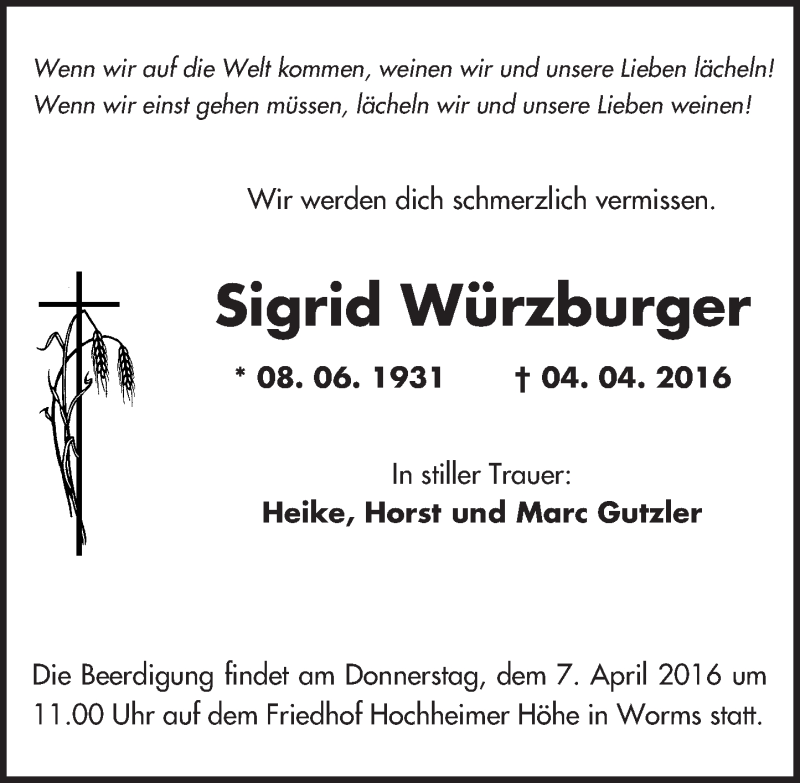 Hier finden Sie alle Traueranzeigen aus der Zeitung, die bisher für Sigrid Würzburger erschienen sind. Weitere Traueranzeigen, die in der Zeitung erscheinen, werden hier ebenfalls aufgelistet