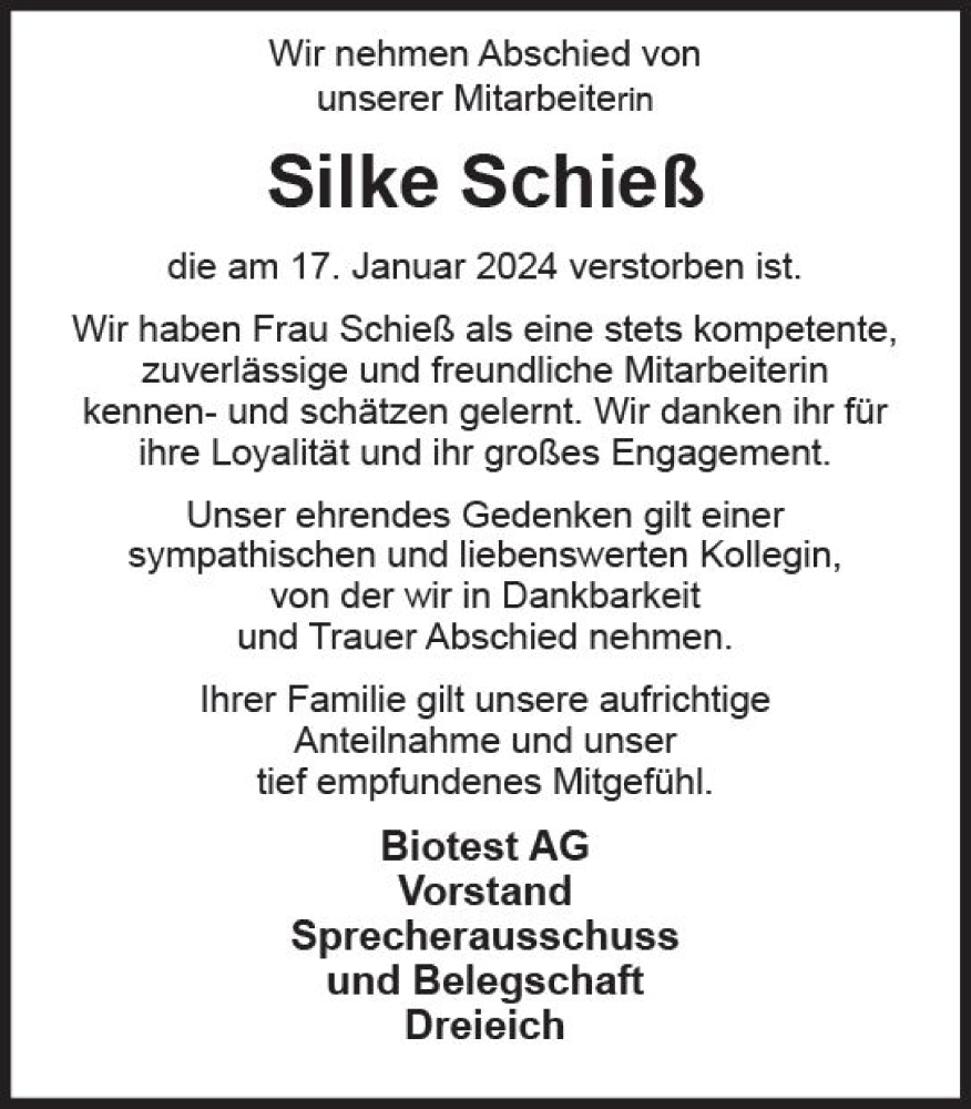Hier finden Sie alle Traueranzeigen aus der Zeitung, die bisher für Silke Schieß erschienen sind. Weitere Traueranzeigen, die in der Zeitung erscheinen, werden hier ebenfalls aufgelistet