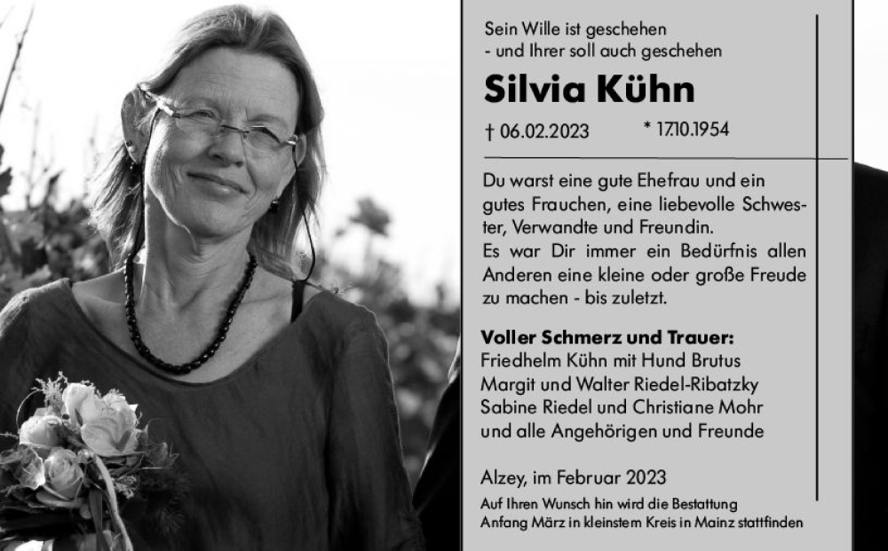 Hier finden Sie alle Traueranzeigen aus der Zeitung, die bisher für Silvia Kühn erschienen sind. Weitere Traueranzeigen, die in der Zeitung erscheinen, werden hier ebenfalls aufgelistet