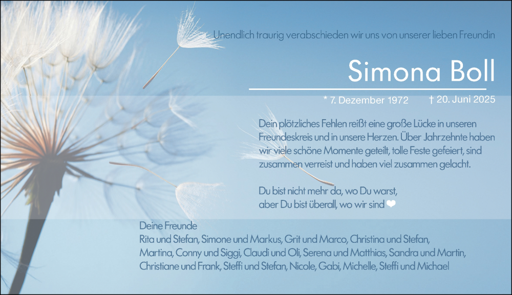 Hier finden Sie alle Traueranzeigen aus der Zeitung, die bisher für Simona Boll erschienen sind. Weitere Traueranzeigen, die in der Zeitung erscheinen, werden hier ebenfalls aufgelistet