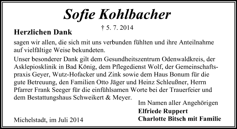 Hier finden Sie alle Traueranzeigen aus der Zeitung, die bisher für Sofie Kohlbacher erschienen sind. Weitere Traueranzeigen, die in der Zeitung erscheinen, werden hier ebenfalls aufgelistet