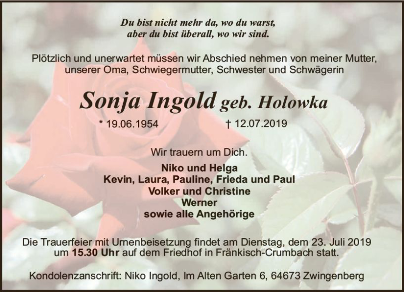 Hier finden Sie alle Traueranzeigen aus der Zeitung, die bisher für Sonja Ingold erschienen sind. Weitere Traueranzeigen, die in der Zeitung erscheinen, werden hier ebenfalls aufgelistet