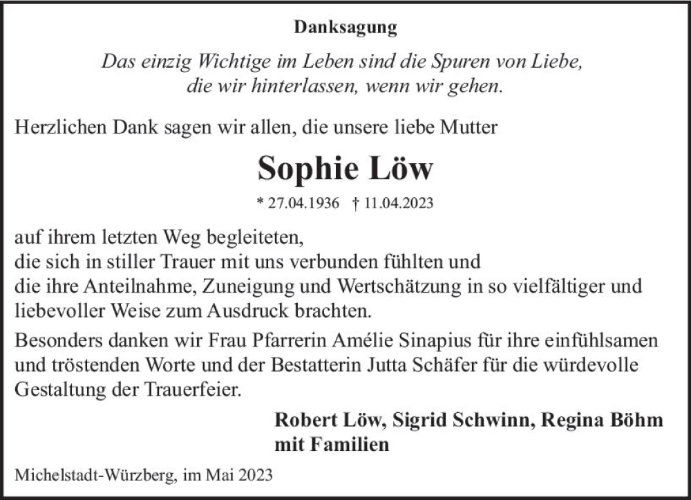 Hier finden Sie alle Traueranzeigen aus der Zeitung, die bisher für Sophie Löw erschienen sind. Weitere Traueranzeigen, die in der Zeitung erscheinen, werden hier ebenfalls aufgelistet