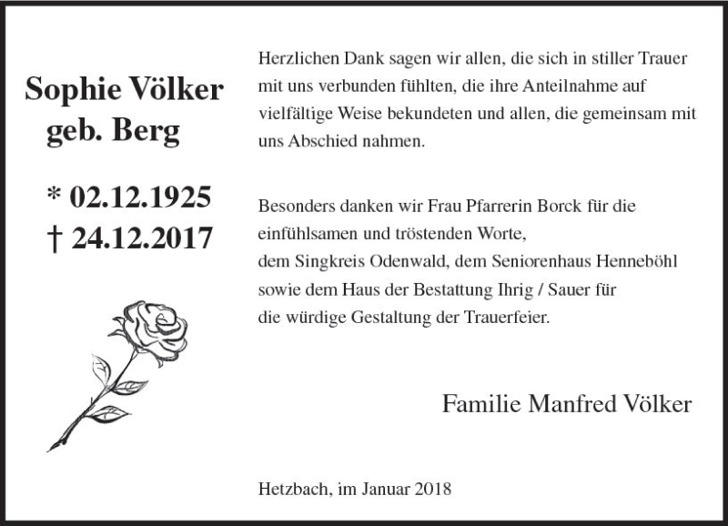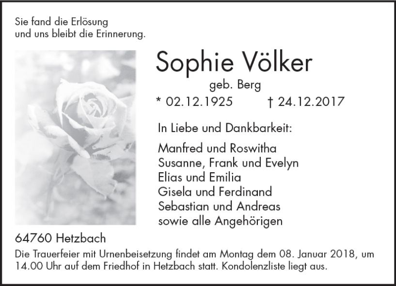 Hier finden Sie alle Traueranzeigen aus der Zeitung, die bisher für Sophie Völker erschienen sind. Weitere Traueranzeigen, die in der Zeitung erscheinen, werden hier ebenfalls aufgelistet