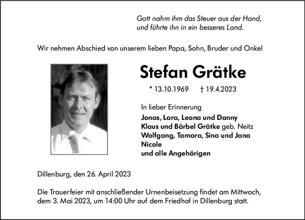 Hier finden Sie alle Traueranzeigen aus der Zeitung, die bisher für Stefan Grätke erschienen sind. Weitere Traueranzeigen, die in der Zeitung erscheinen, werden hier ebenfalls aufgelistet
