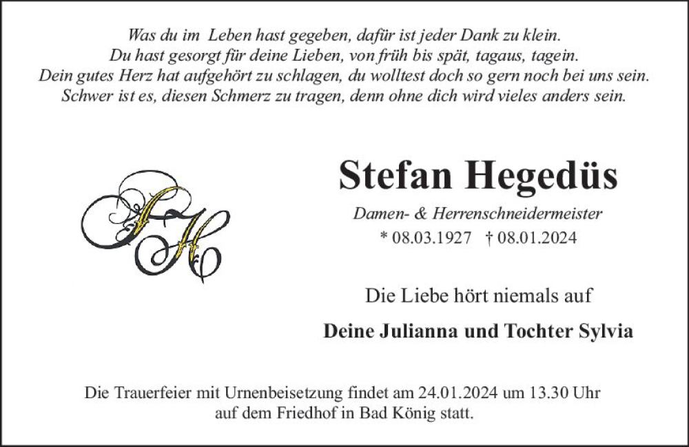 Hier finden Sie alle Traueranzeigen aus der Zeitung, die bisher für Stefan Hegedüs erschienen sind. Weitere Traueranzeigen, die in der Zeitung erscheinen, werden hier ebenfalls aufgelistet