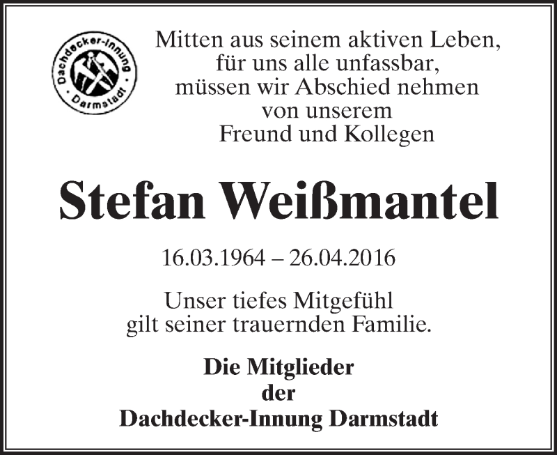 Hier finden Sie alle Traueranzeigen aus der Zeitung, die bisher für Stefan Weißmantel erschienen sind. Weitere Traueranzeigen, die in der Zeitung erscheinen, werden hier ebenfalls aufgelistet