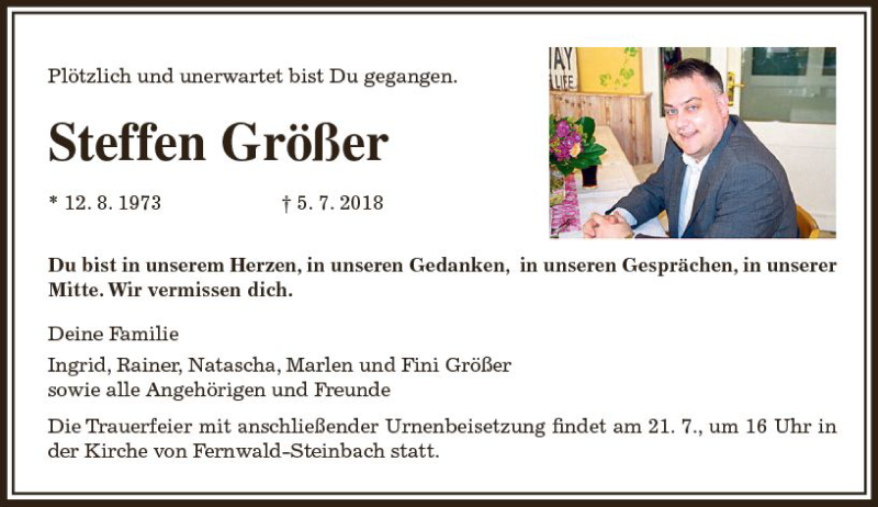 Hier finden Sie alle Traueranzeigen aus der Zeitung, die bisher für Steffen Größer erschienen sind. Weitere Traueranzeigen, die in der Zeitung erscheinen, werden hier ebenfalls aufgelistet