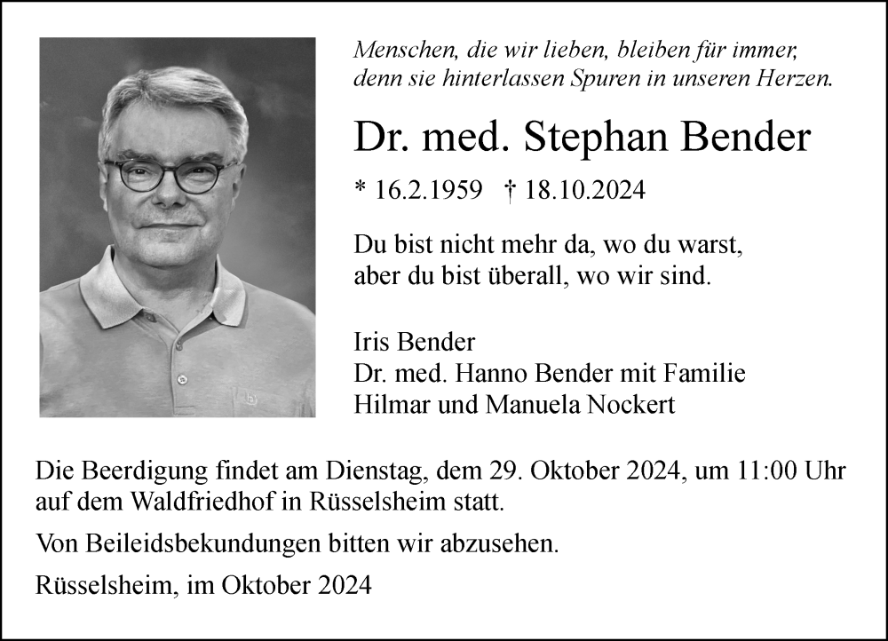 Hier finden Sie alle Traueranzeigen aus der Zeitung, die bisher für Stephan Bender erschienen sind. Weitere Traueranzeigen, die in der Zeitung erscheinen, werden hier ebenfalls aufgelistet