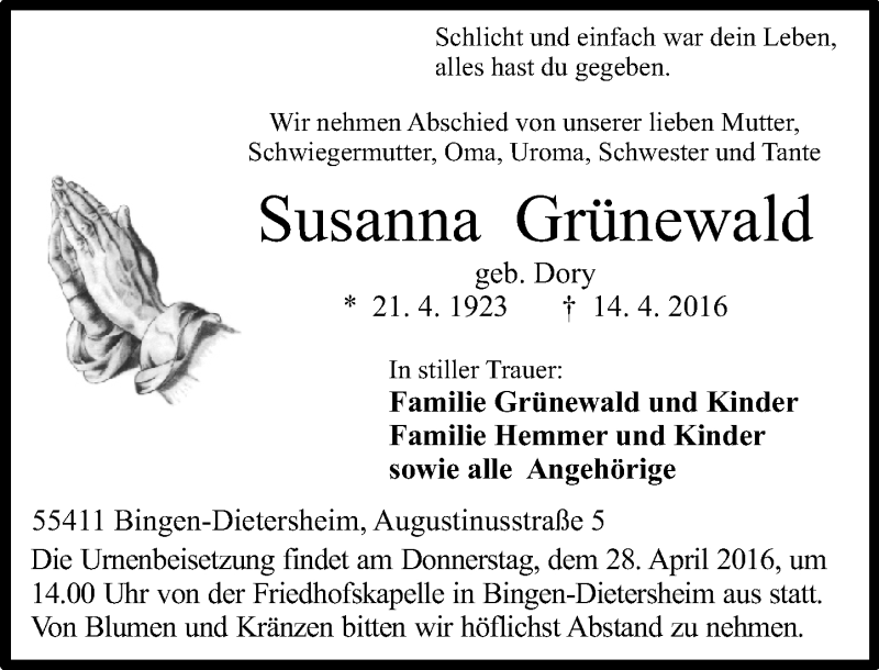 Hier finden Sie alle Traueranzeigen aus der Zeitung, die bisher für Susanna Grünewald erschienen sind. Weitere Traueranzeigen, die in der Zeitung erscheinen, werden hier ebenfalls aufgelistet