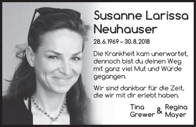 Hier finden Sie alle Traueranzeigen aus der Zeitung, die bisher für Susanne Larissa Neuhauser erschienen sind. Weitere Traueranzeigen, die in der Zeitung erscheinen, werden hier ebenfalls aufgelistet