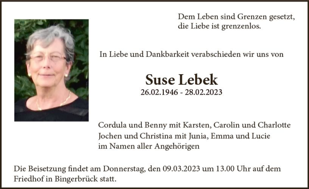 Hier finden Sie alle Traueranzeigen aus der Zeitung, die bisher für Suse Lebek erschienen sind. Weitere Traueranzeigen, die in der Zeitung erscheinen, werden hier ebenfalls aufgelistet