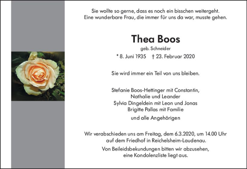 Hier finden Sie alle Traueranzeigen aus der Zeitung, die bisher für Thea Boos erschienen sind. Weitere Traueranzeigen, die in der Zeitung erscheinen, werden hier ebenfalls aufgelistet