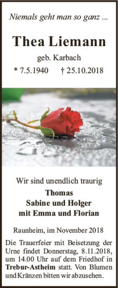 Hier finden Sie alle Traueranzeigen aus der Zeitung, die bisher für Thea Liemann erschienen sind. Weitere Traueranzeigen, die in der Zeitung erscheinen, werden hier ebenfalls aufgelistet