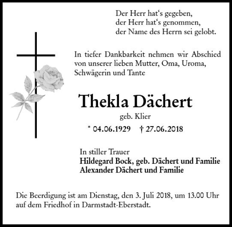 Hier finden Sie alle Traueranzeigen aus der Zeitung, die bisher für Thekla Dächert erschienen sind. Weitere Traueranzeigen, die in der Zeitung erscheinen, werden hier ebenfalls aufgelistet