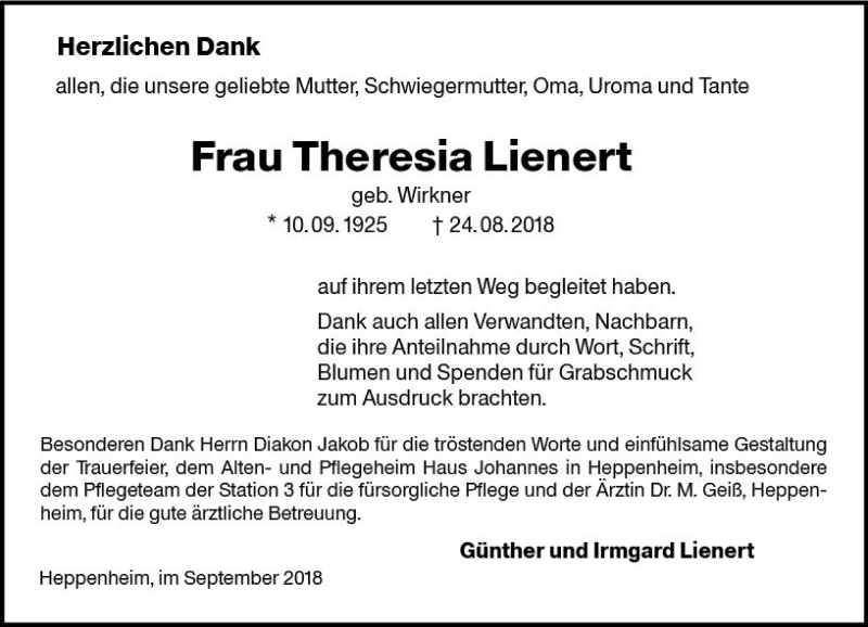 Hier finden Sie alle Traueranzeigen aus der Zeitung, die bisher für Theresia Lienert erschienen sind. Weitere Traueranzeigen, die in der Zeitung erscheinen, werden hier ebenfalls aufgelistet