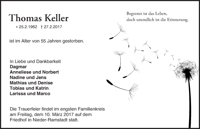 Hier finden Sie alle Traueranzeigen aus der Zeitung, die bisher für Thomas Keller erschienen sind. Weitere Traueranzeigen, die in der Zeitung erscheinen, werden hier ebenfalls aufgelistet