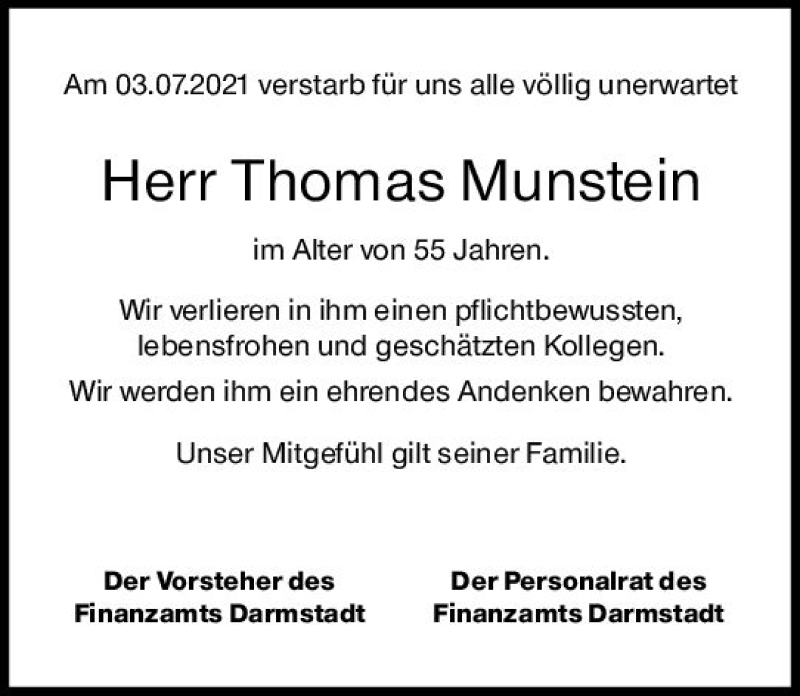 Hier finden Sie alle Traueranzeigen aus der Zeitung, die bisher für Thomas Munstein erschienen sind. Weitere Traueranzeigen, die in der Zeitung erscheinen, werden hier ebenfalls aufgelistet