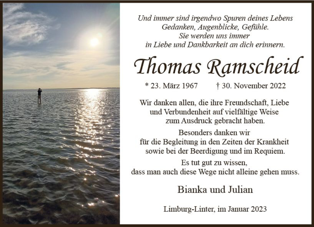 Hier finden Sie alle Traueranzeigen aus der Zeitung, die bisher für Thomas Ramscheid erschienen sind. Weitere Traueranzeigen, die in der Zeitung erscheinen, werden hier ebenfalls aufgelistet