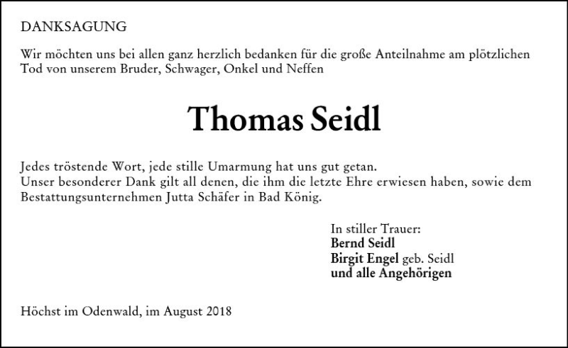 Hier finden Sie alle Traueranzeigen aus der Zeitung, die bisher für Thomas Seidl erschienen sind. Weitere Traueranzeigen, die in der Zeitung erscheinen, werden hier ebenfalls aufgelistet