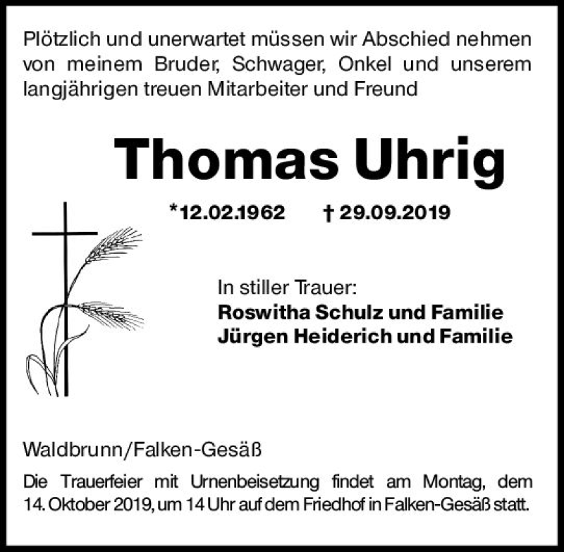 Hier finden Sie alle Traueranzeigen aus der Zeitung, die bisher für Thomas Uhrig erschienen sind. Weitere Traueranzeigen, die in der Zeitung erscheinen, werden hier ebenfalls aufgelistet